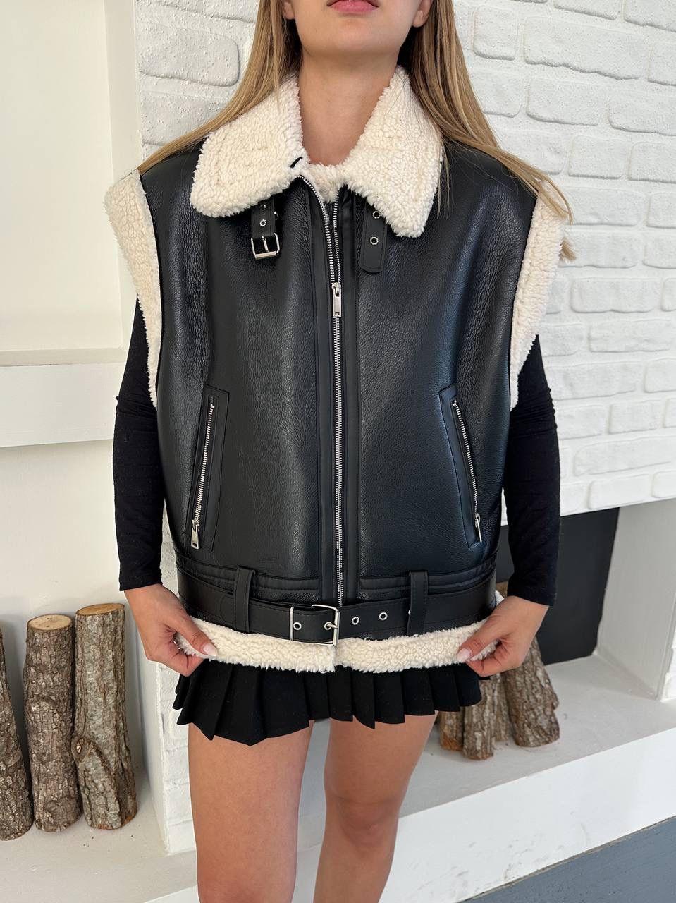 Siyah Oversize İçi Peluş Deri Biker Yelek