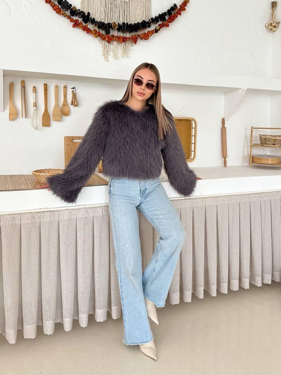 Antrasit Kadın Kısa Premium Kürk Kazak