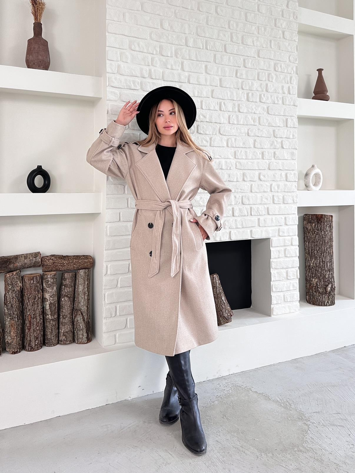 Bej Kaşe Kolu Kemerli Düğmeli Kaban