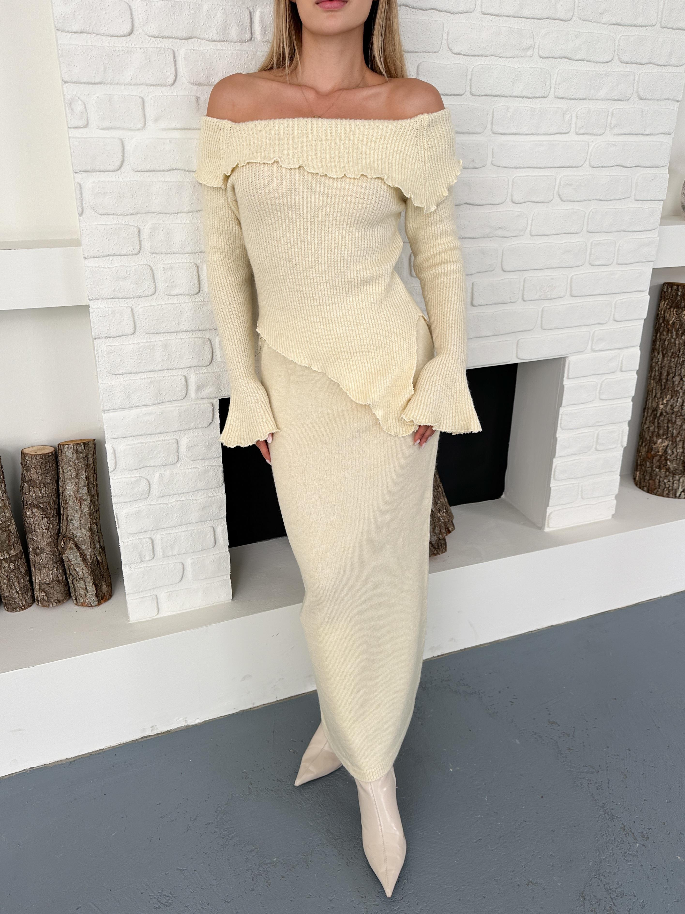 Bej Lüks Asimetrik Kesim Bluz Etek Triko Takım