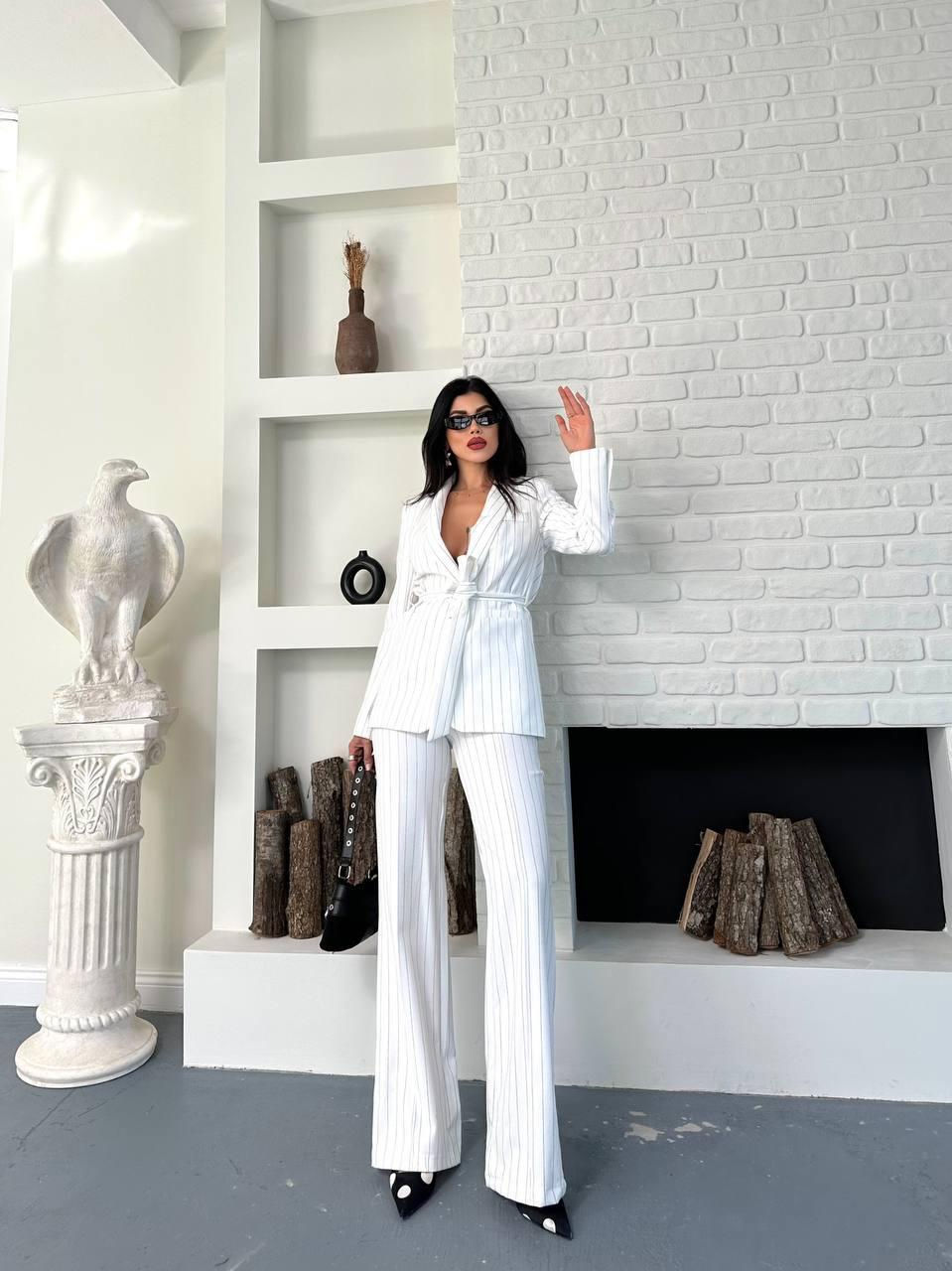 Beyaz-Çizgili Kuşaklı Bağlamalı Ceket Pantolon Blazer Takım