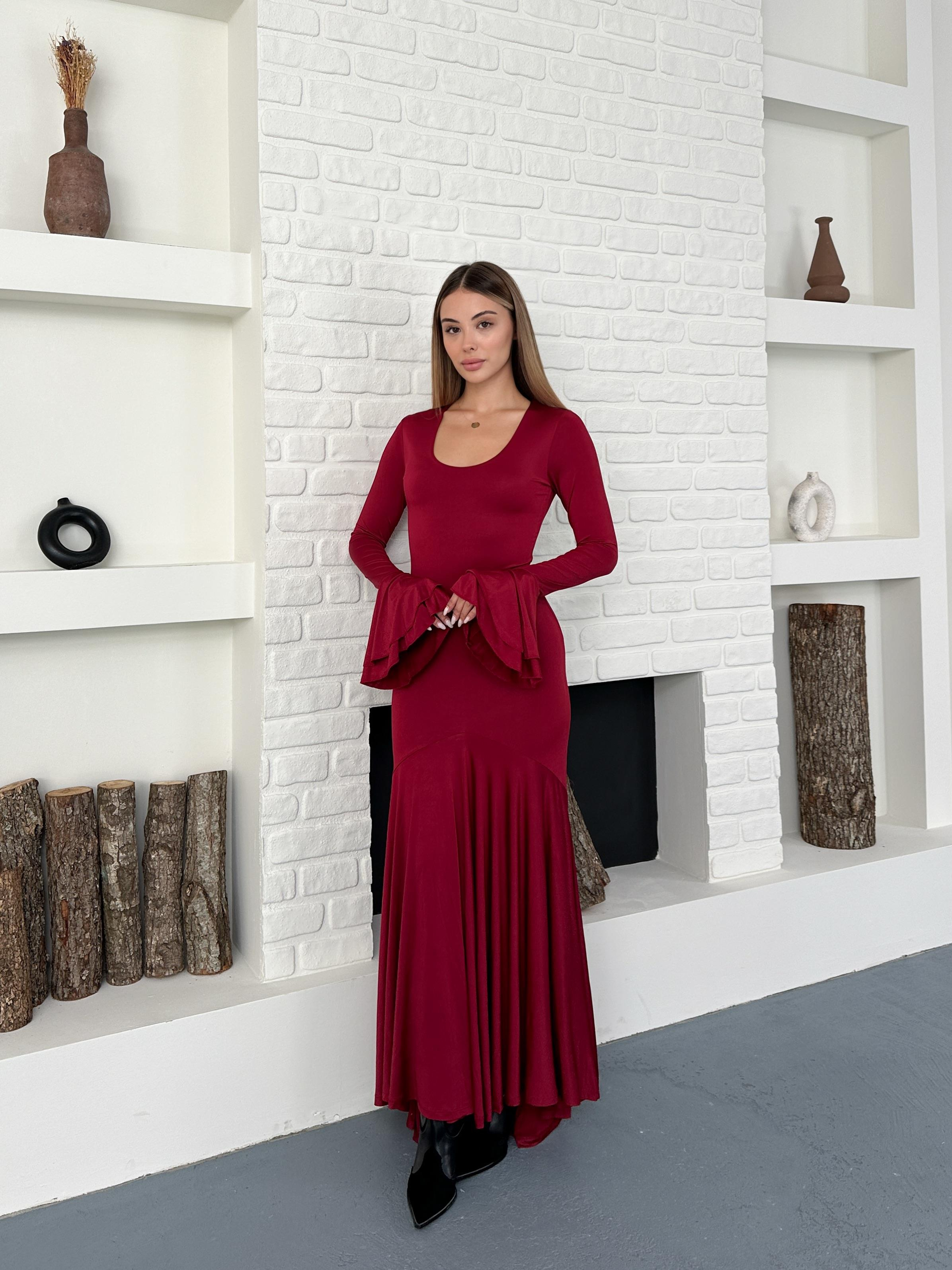 Bordo İspanyol Kol U Yaka Sandy Maxi Elbise