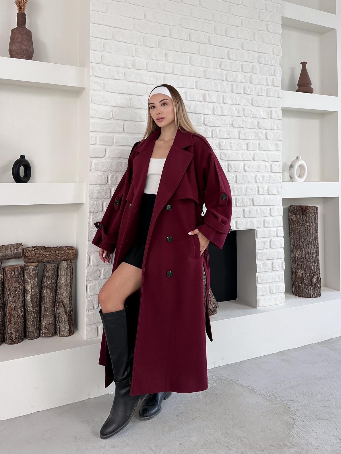 Bordo Kaşe Pelerinli Kuşaklı Düğmeli Oversize Kaban
