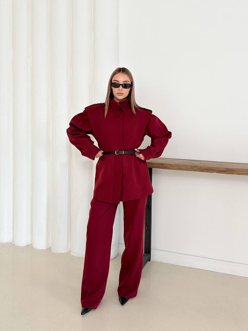 Bordo Kemerli Apoletli Ceket Pantolon Takım