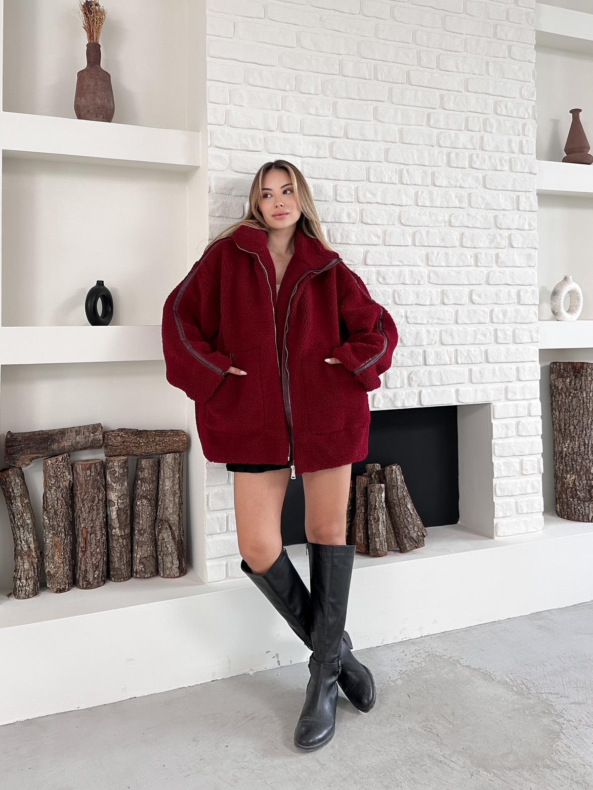 Bordo Peluş Fermuarlı Oversize Biker Mont