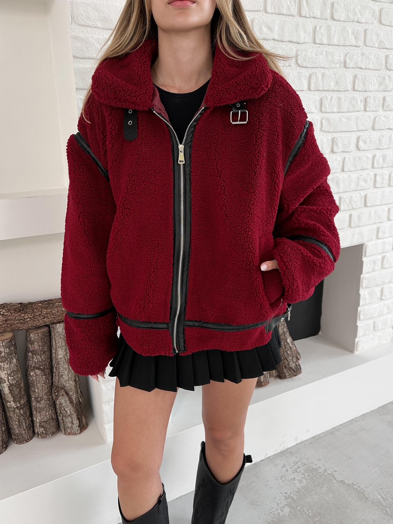 Bordo Peluş Fermuarlı Oversize Kuzu Mont