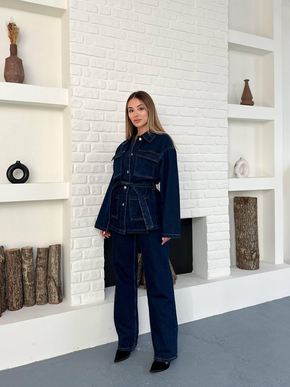 Düğmeli Kuşaklı Lacivert Ceket Pantolon Denim Takım