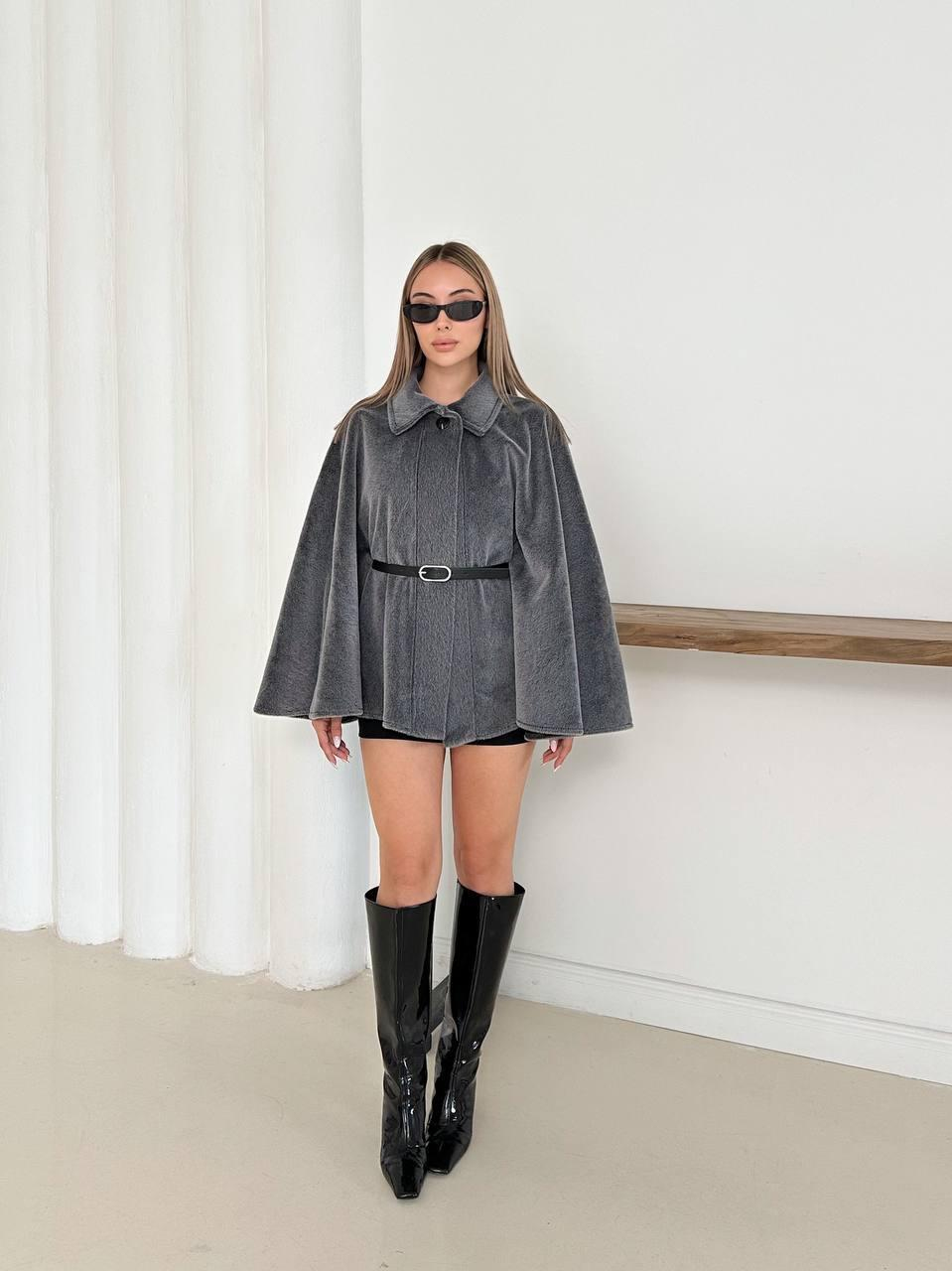 Gri Kemer Detaylı Yumuşak Kaşe Pelerin Ceket