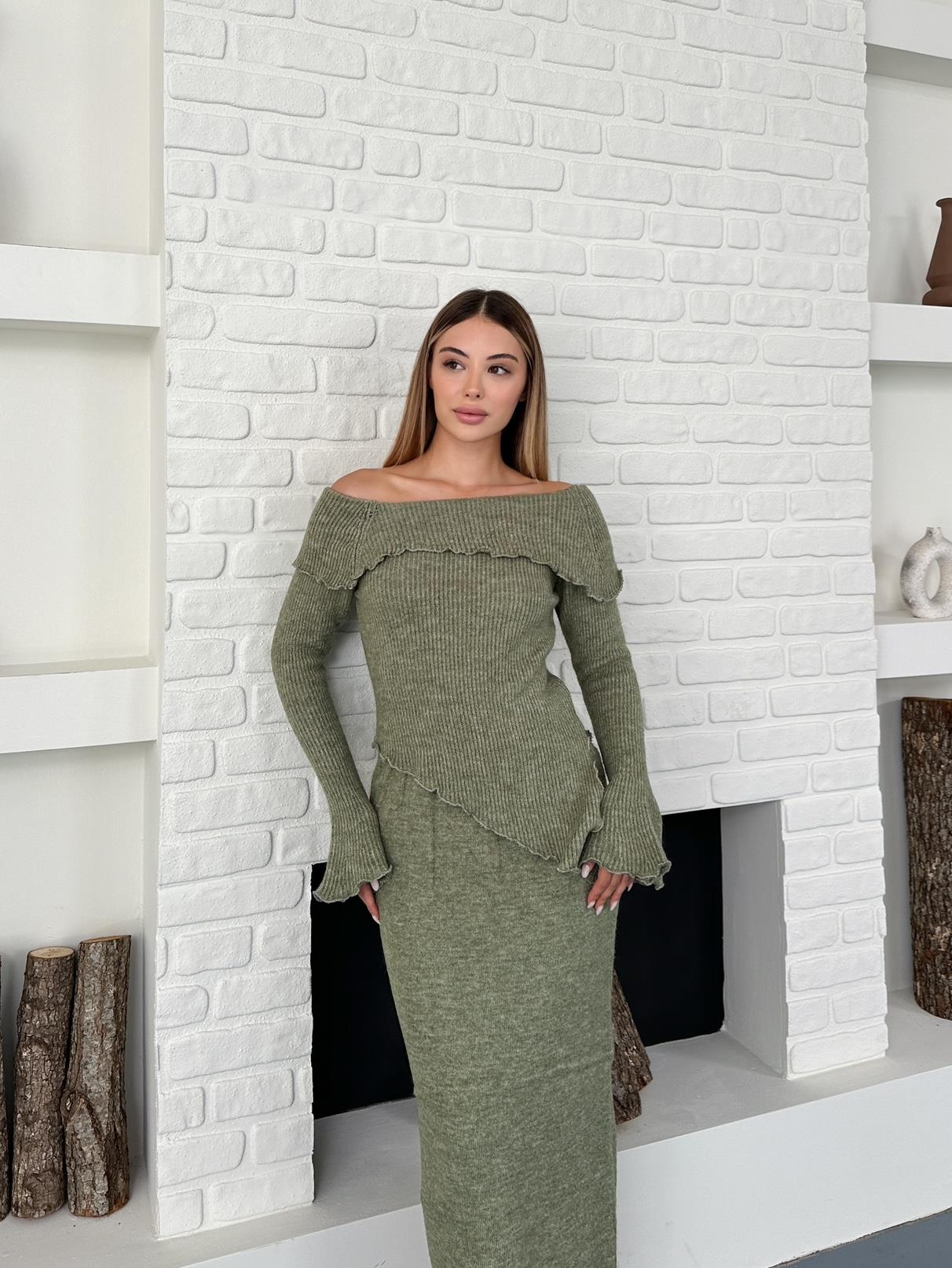 Haki Lüks Asimetrik Kesim Bluz Etek Triko Takım