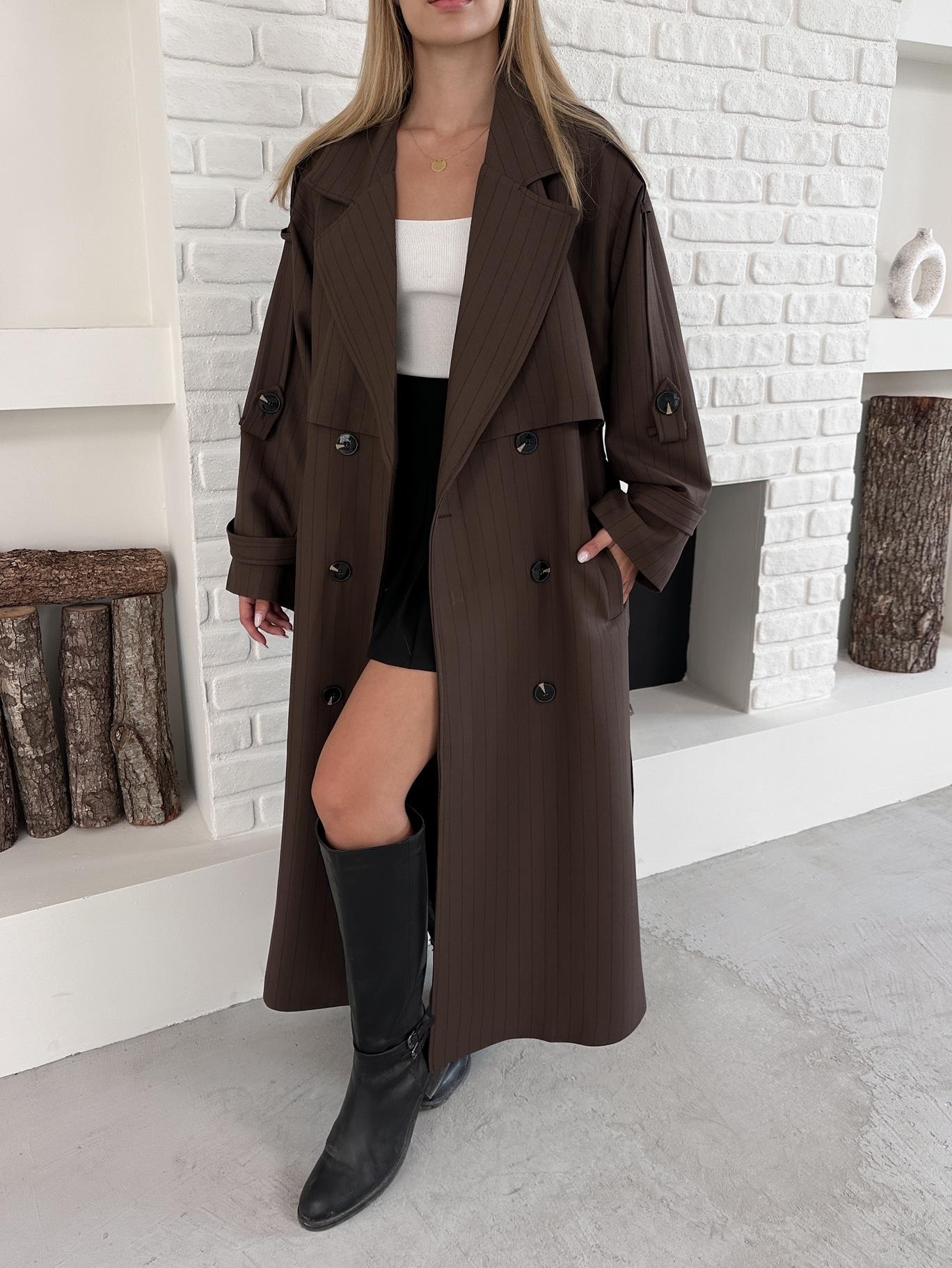 Kahverengi Çizgili Pelerinli Düğmeli Kuşaklı Kaban
