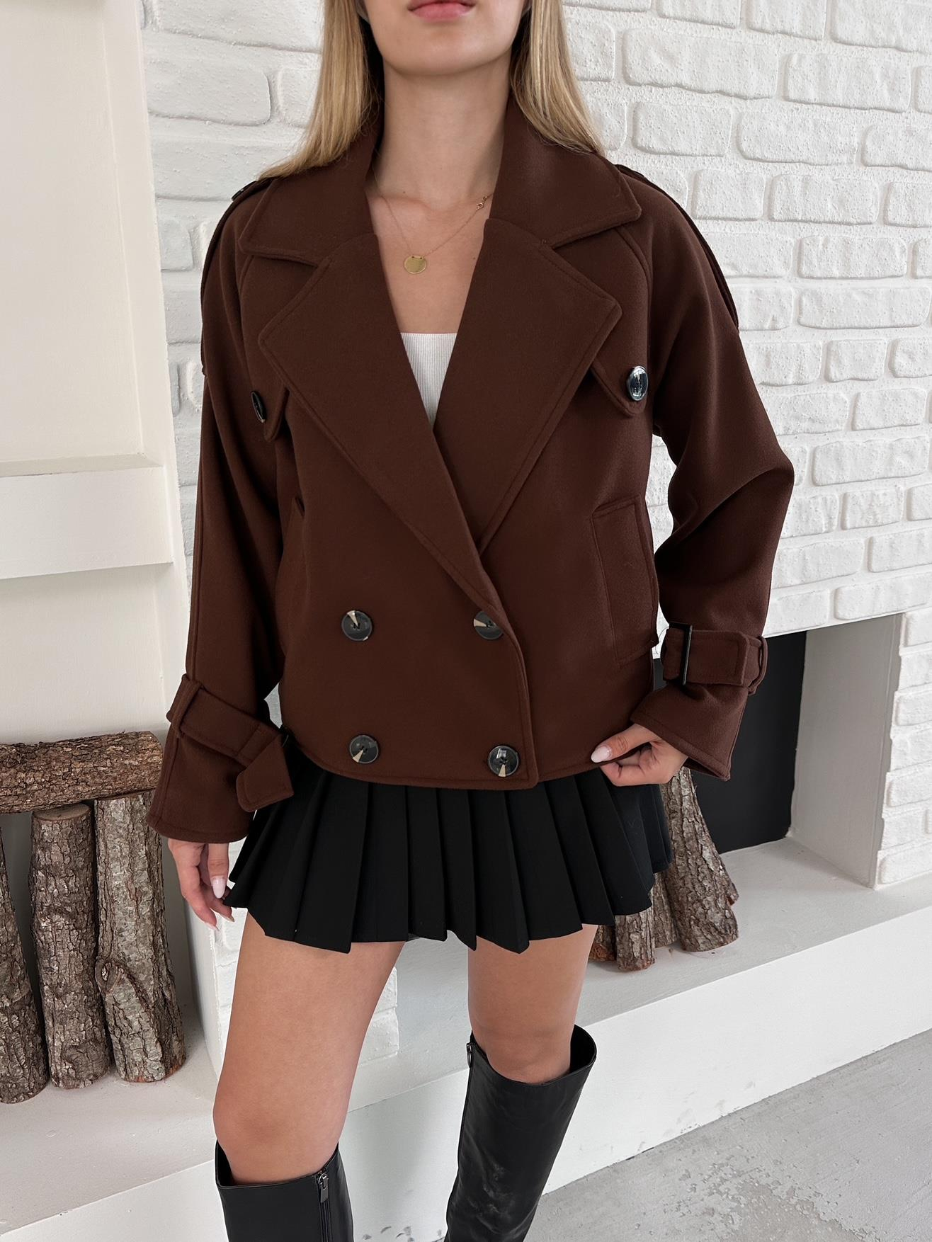 Kahverengi Kaşe Kruvaze Kol Kemerli Düğmeli Ceket