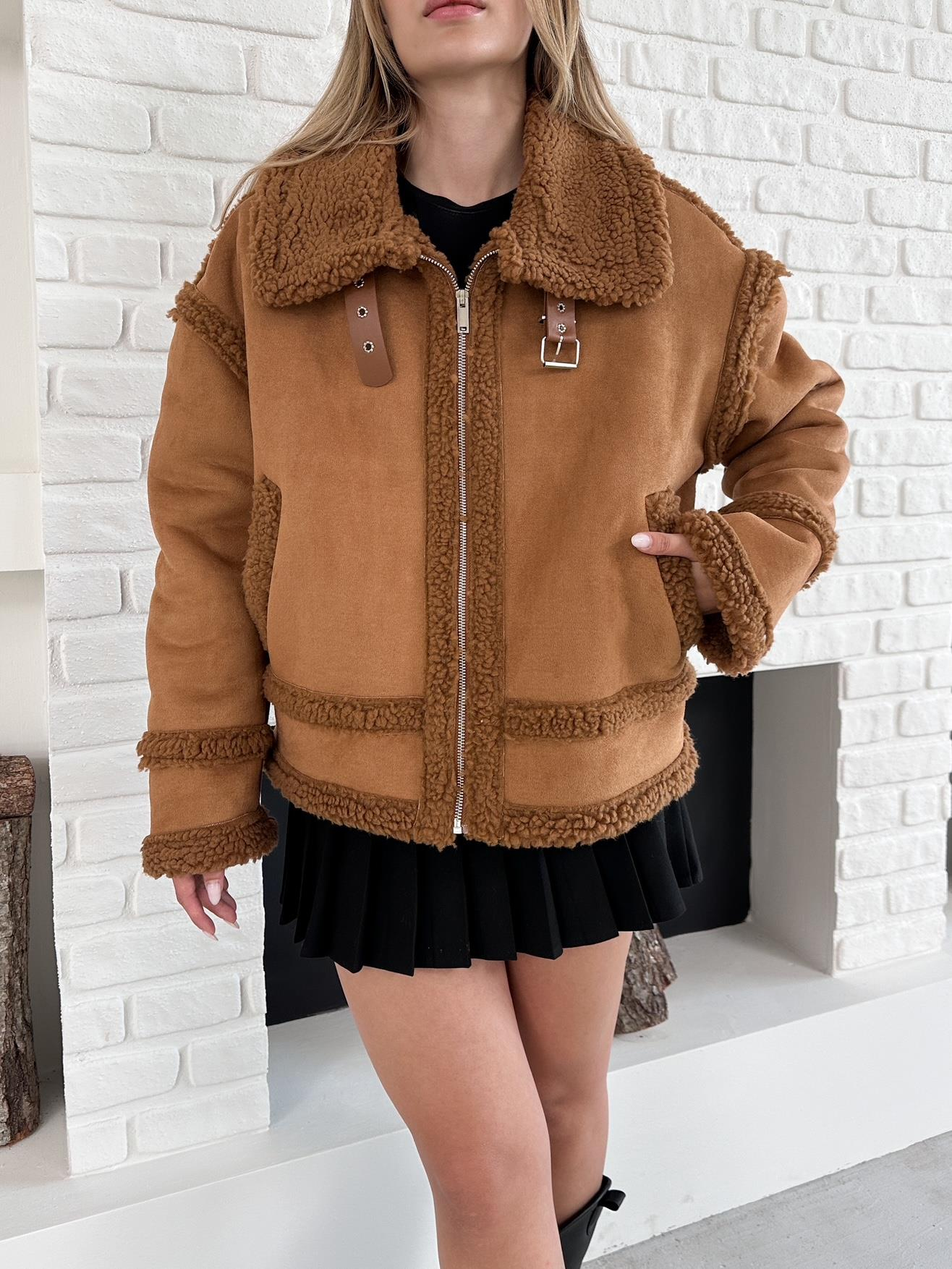 Kahverengi Kontrast Peluş Süet Biker Mont