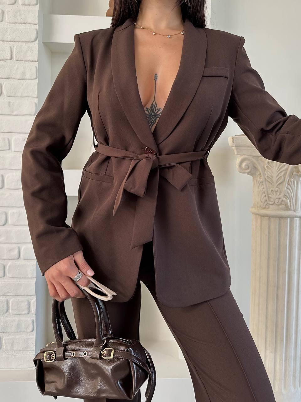 Kahverengi Kuşaklı Bağlamalı Ceket Pantolon Blazer Takım