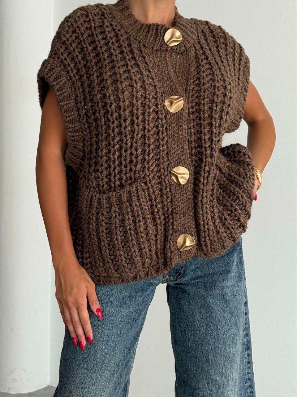 Kahverengi Örme Düğmeli Triko Yelek