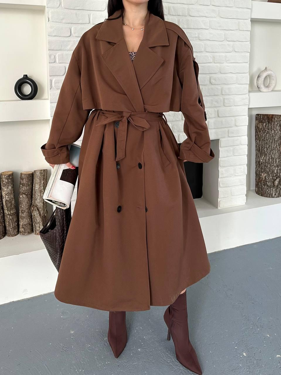 Kahverengi Pelerinli Düğmeli Kuşaklı Maxi Trençkot