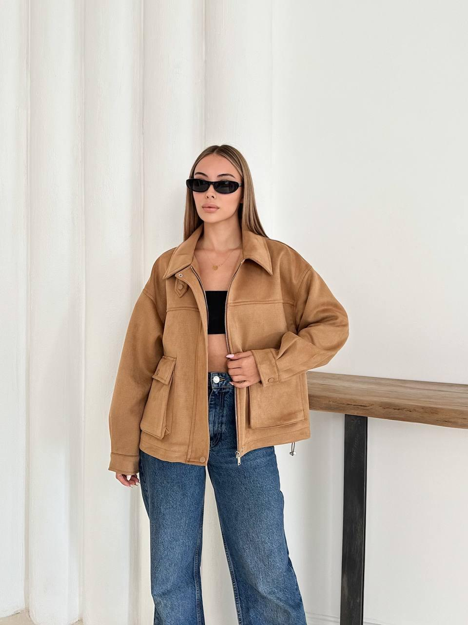 Krem Dik Yaka Süet Bomber Ceket Cepli