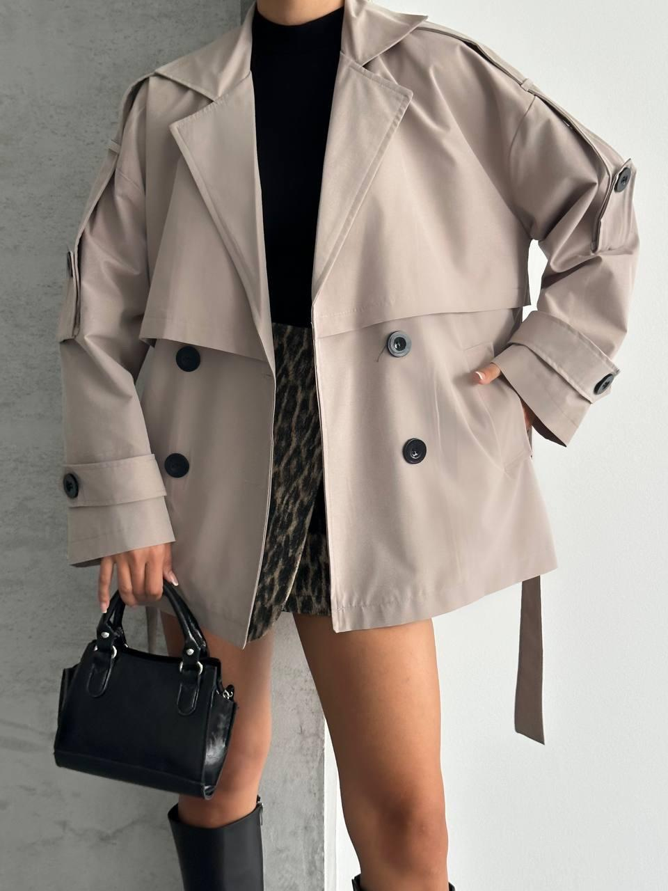 Krem Poliviskon Dizüstü Düğmeli Bağlamalı Trenç