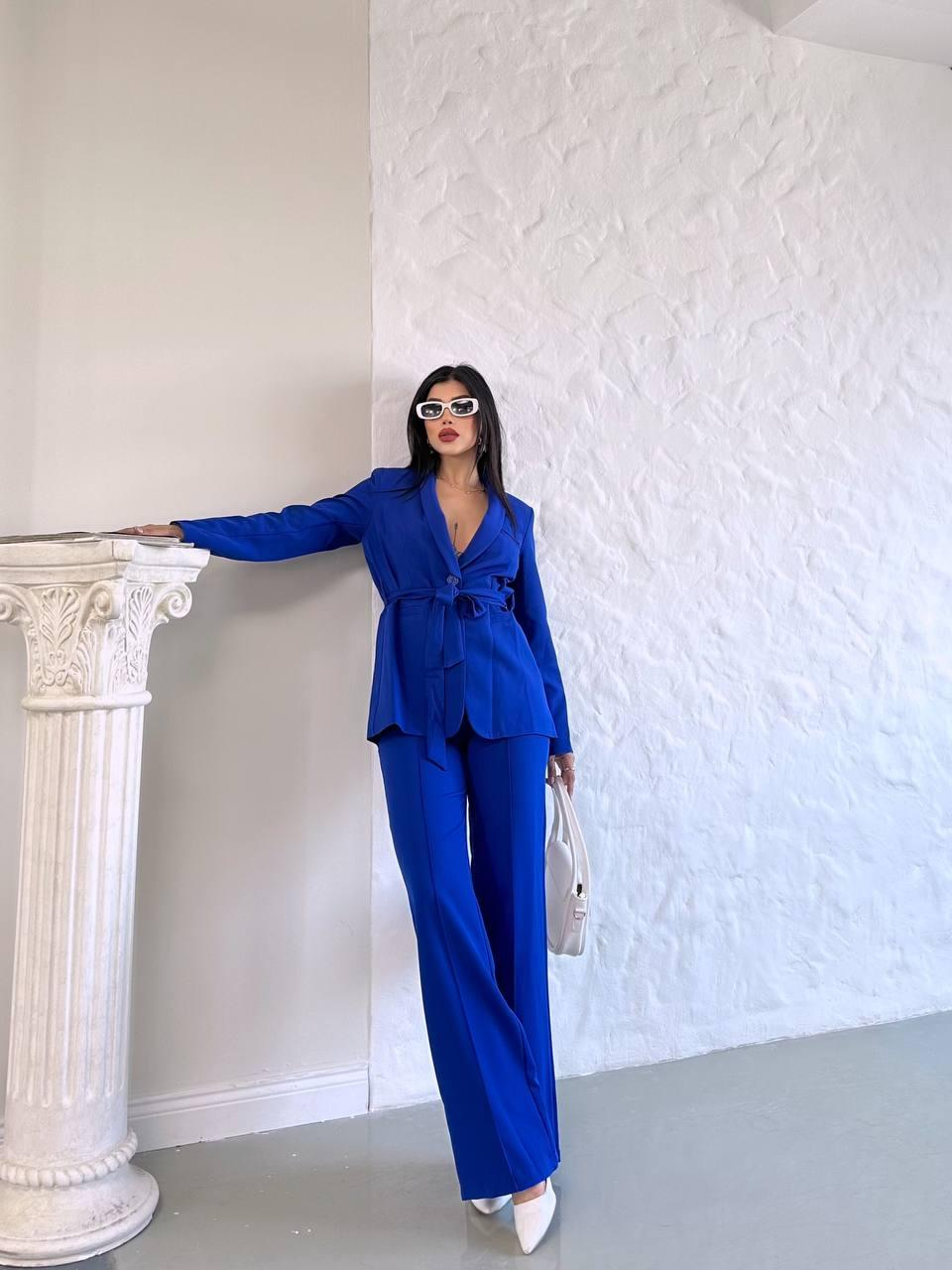 Lacivert Kuşaklı Bağlamalı Ceket Pantolon Blazer Takım