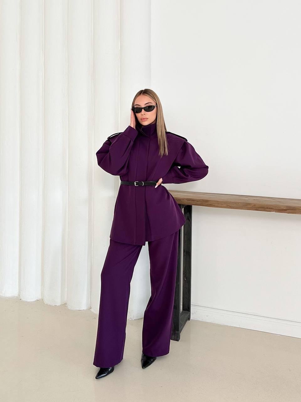 Patlıcan Moru Kemerli Apoletli Ceket Pantolon Takım