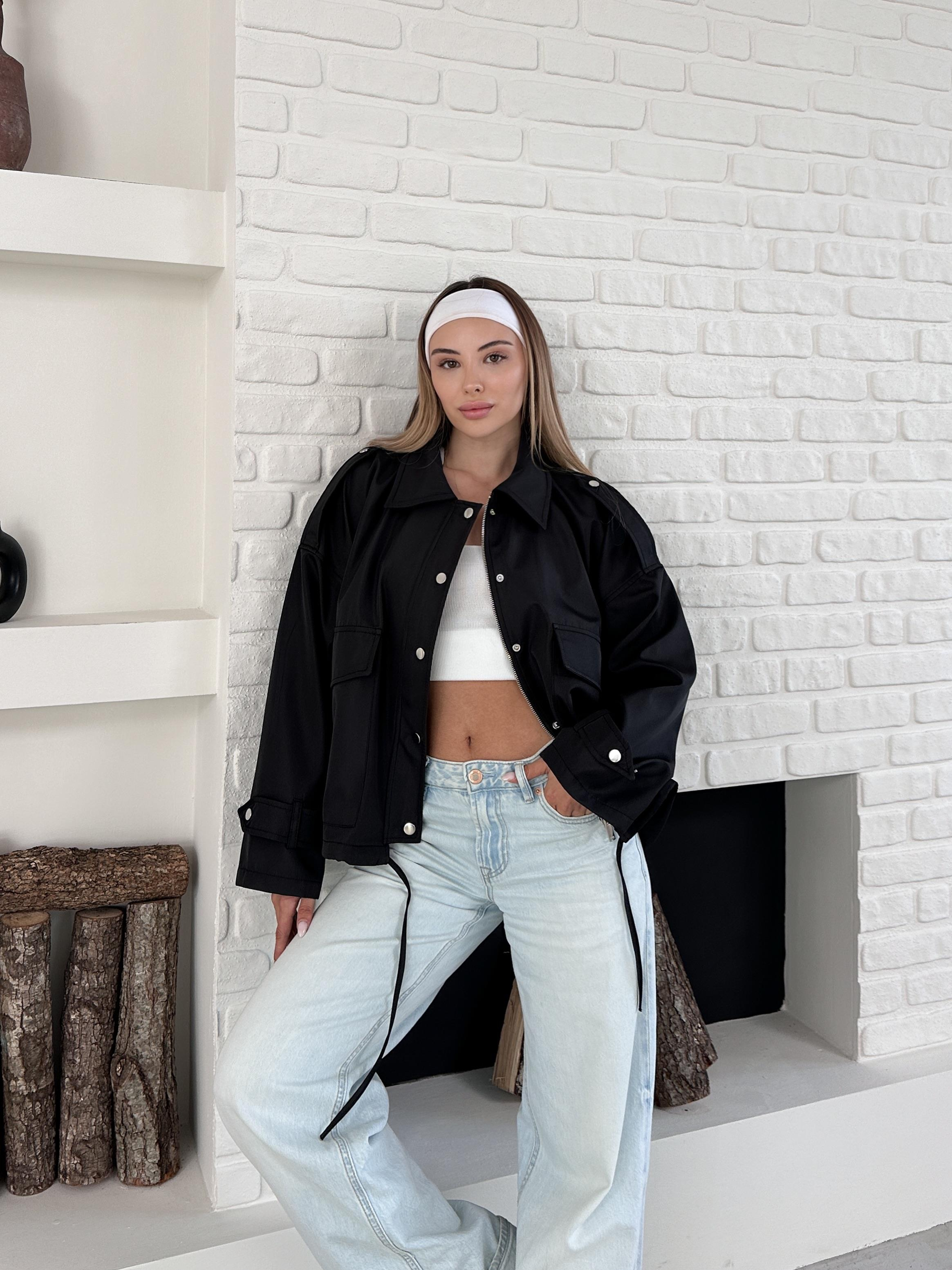 Siyah Bondit Cepli Patlı Crop Baharlık Ceket