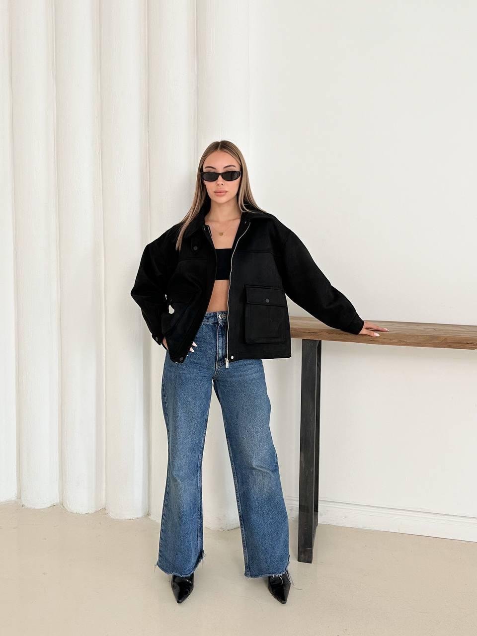 Siyah Dik Yaka Süet Bomber Ceket Cepli