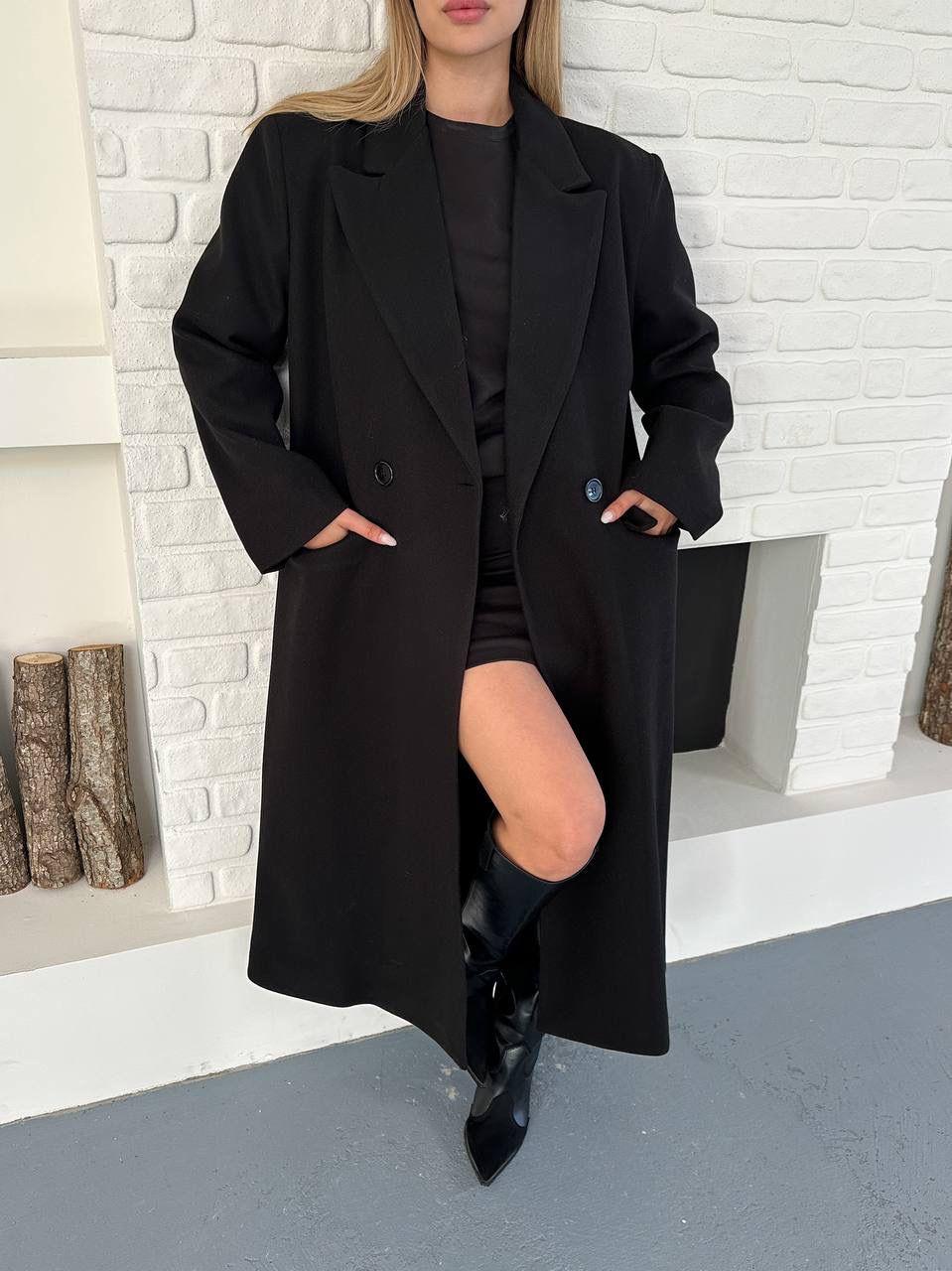 Siyah Düğmeli Klasik Maxi Boy Kaşe Kaban