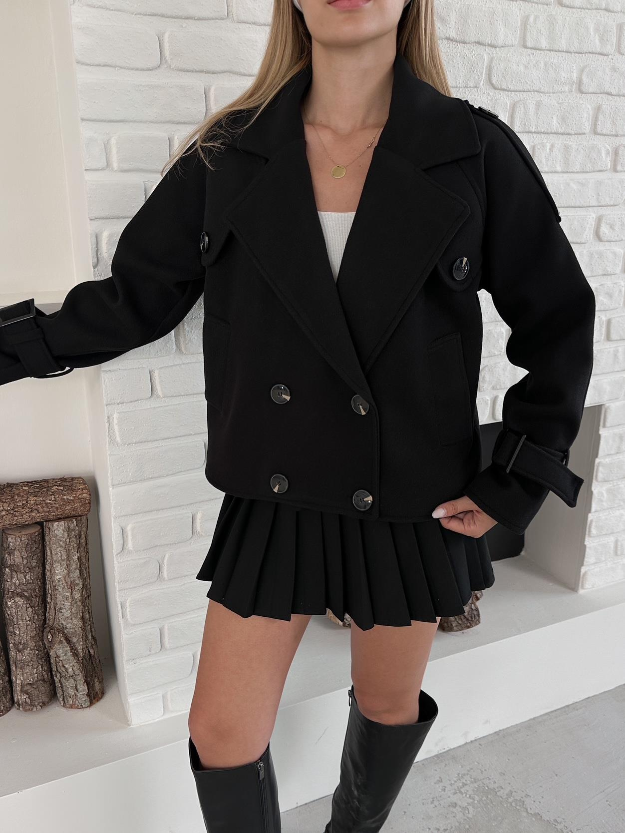 Siyah Kaşe Kruvaze Kol Kemerli Düğmeli Ceket