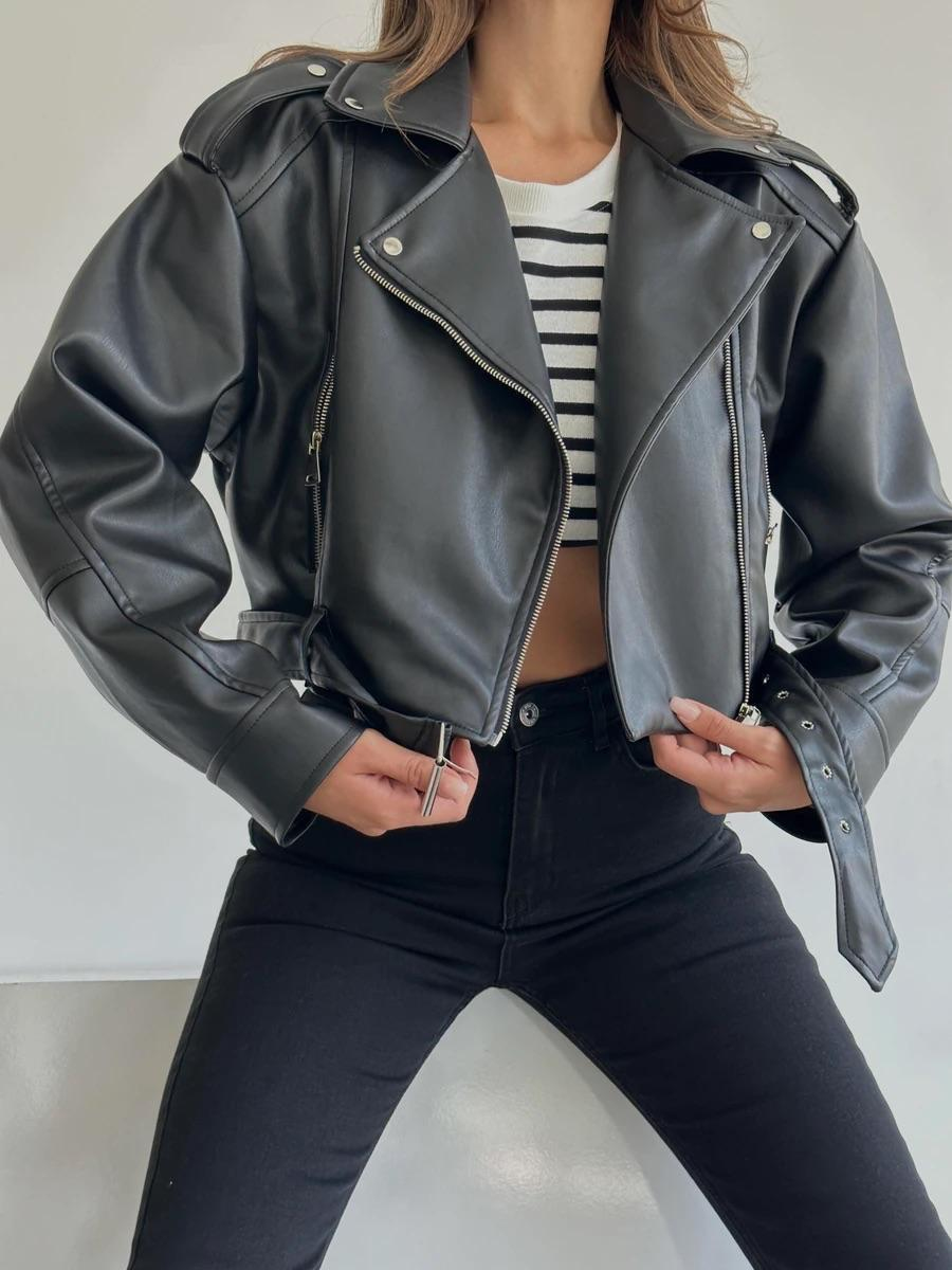 Siyah Kemerli Boyfriend Crop Deri Ceket