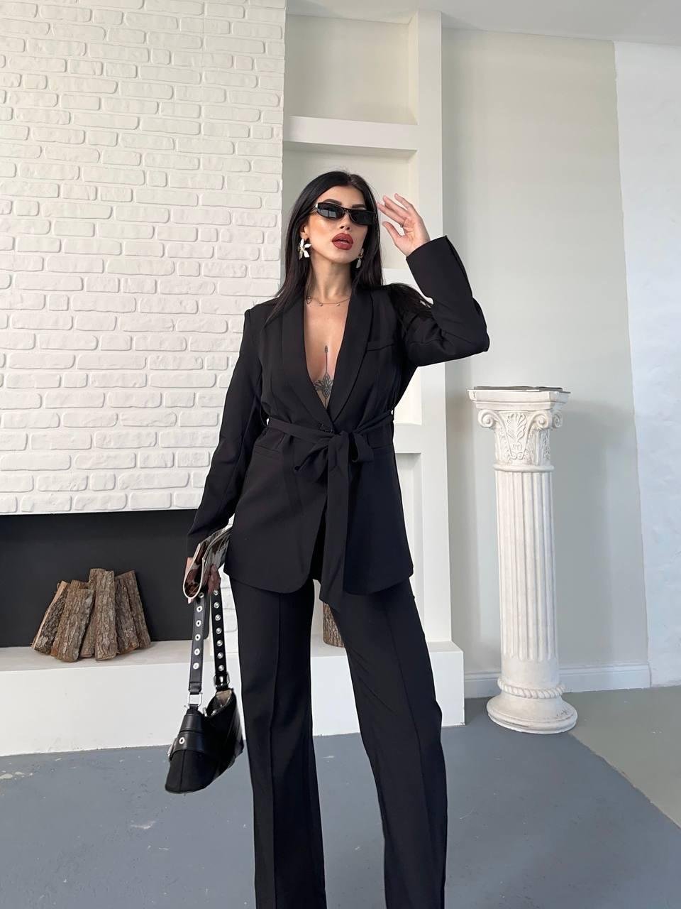 Siyah Kuşaklı Bağlamalı Ceket Pantolon Blazer Takım