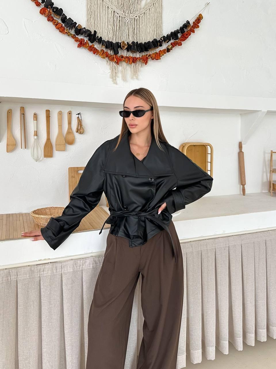 Siyah Kuşaklı Kruvaze Yaka Kısa Deri Trençkot