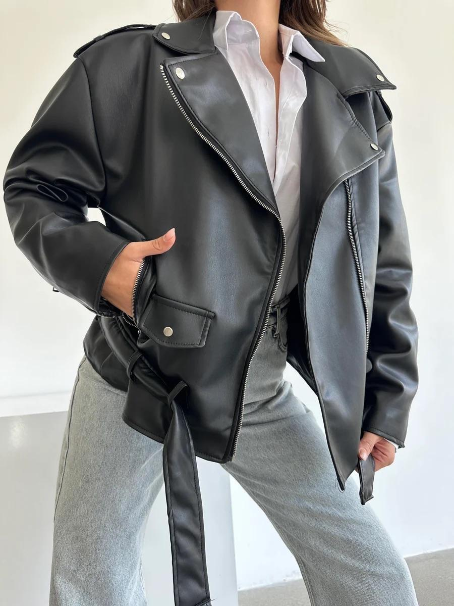 Siyah Oversize Boyfriend Kemerli Deri Ceket