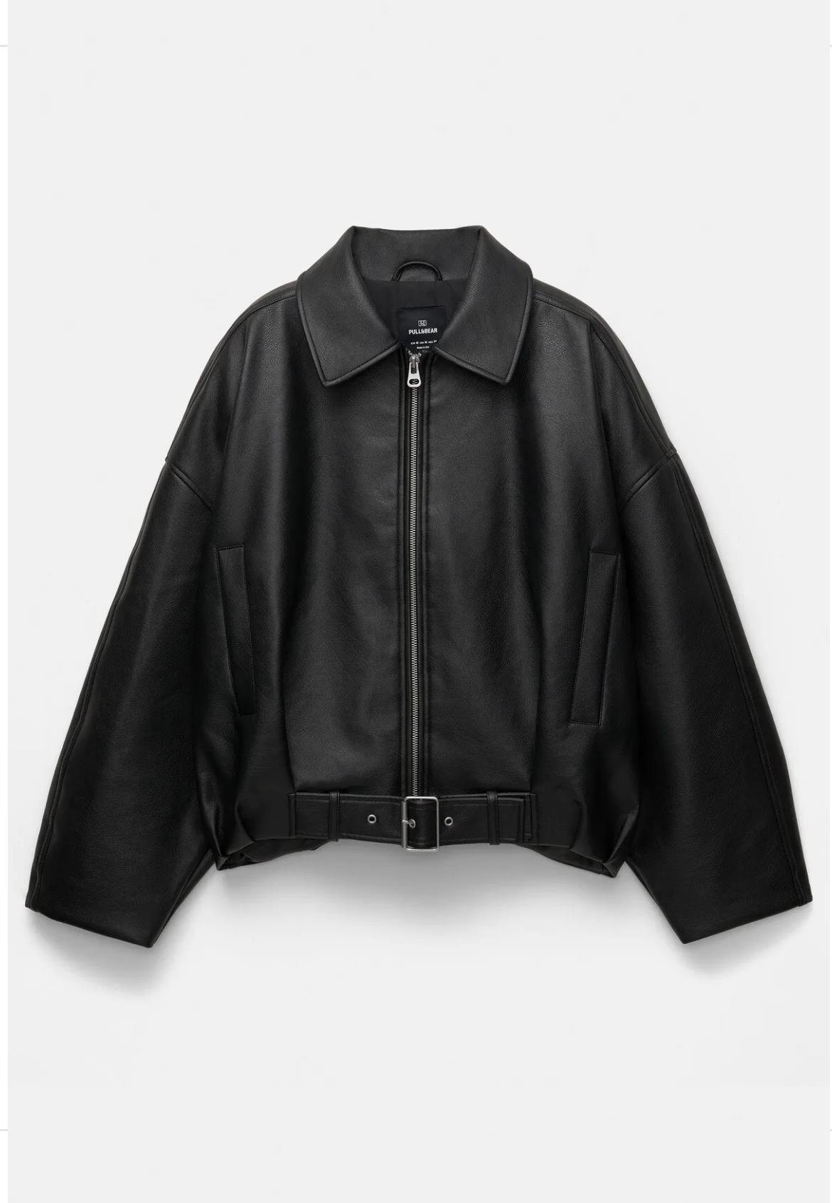 Siyah Oversize Kemerli Bomber Deri Ceket